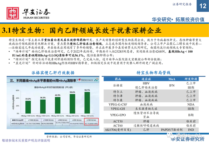 特宝生物:深耕临床多年,派格宾已进行多年真实世界大队列研究,临床端医患接受度高,是国内仅有的经过大队列验证的乙肝临床治愈疗法;应用线数靠前,接续核苷类似物进行治疗或单药使用,且在研创新药物多数需与干扰素联用;市场稀缺性,目前国内仅派格宾一款上市产品,持续放量中;