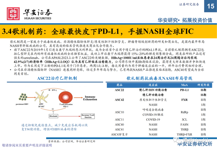 歌礼制药:全球进度最快,皮下注射慢乙肝PD-L1抑制剂已到IIb期临床,领先MNC;小样本临床结果优异,可达42.9%(3/7)临床治愈率;NASH领域2款产品潜在同类FIC,关注公司在肝脏疾病领域(HBV、NASH)的进展;