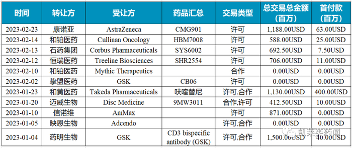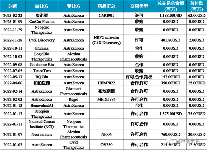 依托持续的研发投入、对外合作收购,目前,阿斯利康建立了强大的新药管线。将2022年至今阿斯利康的交易情况统计如下: