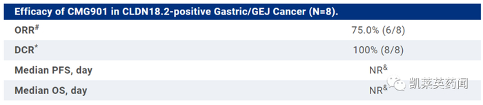 研究结果显示:(1)CMG901安全性和耐受性良好,3/27例(11.1%)患者发生药物3级相关不良事件,没有发生4级及以上药物相关不良事件。剂量递增成功至3.4 mg/kg,且尚未达到最大耐受剂量(MTD)。仅2.2 mg/kg组1例患者发生剂量限制性毒性。(2)8例接受CMG901治疗的Claudin 18.2阳性胃癌或胃食管结合部腺癌患者中,客观缓解率为75%,疾病控制率为100%。其中,2.6、3.0和3.4mg/kg队列患者的客观缓解率均为100%。中位无进展生存时间(mPFS)和中位总生存时间(mOS)均尚未达到。CMG901展示出良好的安全性和耐受性。