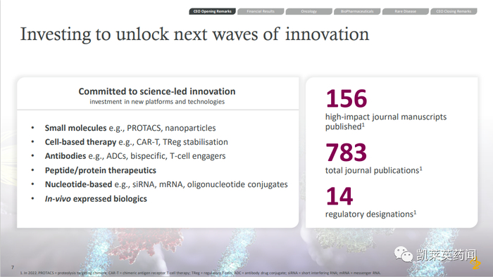 在2022年报中,阿斯利康表示当前及未来将重视投资下一代创新疗法,包括:小分子如PROTACS、纳米药物;细胞疗法,如CAR-T、TReg细胞疗法;抗体,如ADC、双抗、T细胞衔接器;多肽/蛋白疗法;核酸药物,如siRNA、mRNA、核苷酸偶联物;体内表达生物制剂。