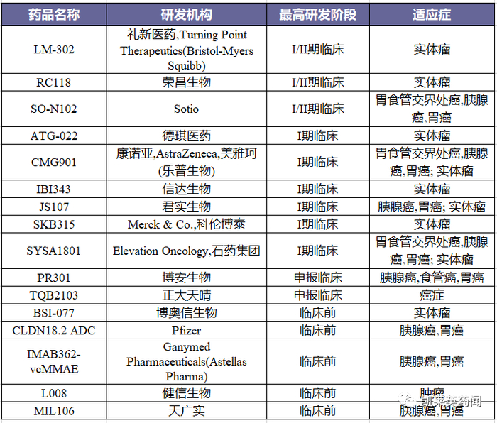 据不完全统计,目前在研的CLDN18.2近百余种,研发药物涵盖单抗、双抗、ADC、CAR-T。其中,在研CLDN18.2ADC药物有16种,以国内企业礼新、荣昌、德琪、康诺亚、信达、君实、科伦、石药领衔。
