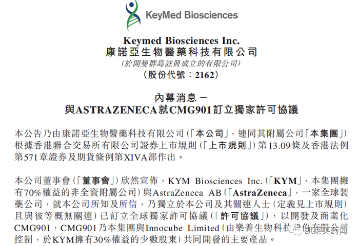 2023年2月23日,康诺亚生物和乐普生物共同宣布,与阿斯利康(“AstraZeneca”)就CMG901达成全球独家授权协议。根据协议条款,由康诺亚和乐普生物合资设立的KYM Biosciences(简称“KYM”)将获得6300万美元的预付款和超过11亿美元的潜在额外研发和销售相关的里程碑付款,以及高达低双位数的分层特许权使用费;阿斯利康将获得 CMG901 研究、开发、注册、生产和商业化的独家全球许可。该交易预计于2023 年上半年完成。
