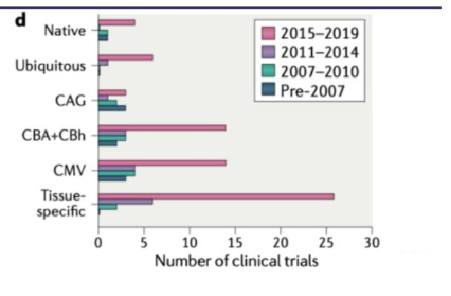 AAV 载体具有器官靶向性、安全性高以及长效性等优点,但同时存在包装容量小、感染到表达的时间比较长等缺点。重组的 AAV2血清型病毒载体仍然处于主流位置。从 2003-2019 年的 144 项披露了 AAV 病毒衣壳数据的临床试验中分析发现,重组的 AAV2 血清型仍然处于主流位置,并且具有最多的安全性和有效性证据,截至 2019 年末已经有超过40 项使用 AAV2 病毒载体的临床试验完成全部流程。利用组织特异性启动子实现组织特异性表达成为新趋势。从104 项披露了启动子数据的临床试验中分析发现,像 CBA、CAG 和 CMV 等泛表达类的启动子依然受到研究者的广泛青睐,而在 2015-2019年间,超过 25 项临床试验使用了组织特异性启动子来实现特定组织的表达,例如白蛋白启动子和突触蛋白启动子等。