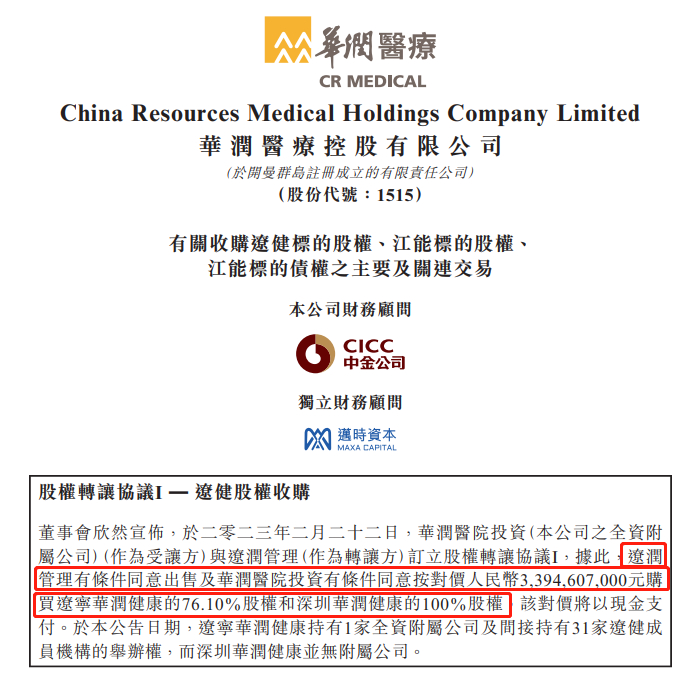 公告称,华润医疗的全资附属公司华润医院投资拟以33.95亿元人民币从辽润管理手中购买辽宁华润健康的76.10%股权和深圳华润健康的100%股权。