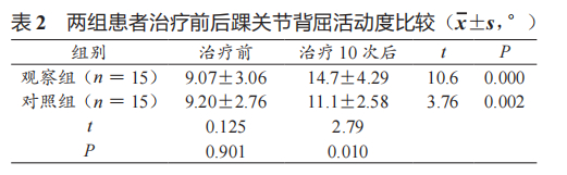 1.两组患者治疗前后踝关节背屈活动度比较: