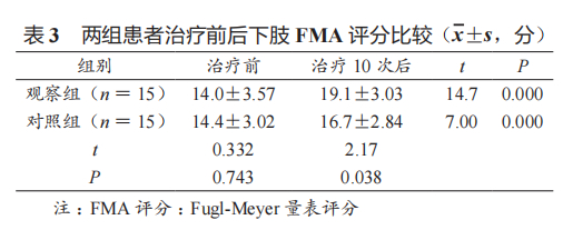治疗前,两组患者的下肢FMA评分无显著差异(P>0.05)。治疗后,两组患者下肢FMA评分较治疗前均显著提高(P<0.05),且观察组患者的下肢FMA评分显著高于对照组(P<0.05)(表3)。