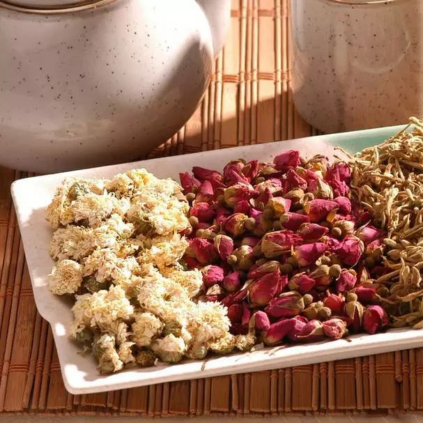 方解:女性心思细腻,容易生气,易肝郁气滞,肝火旺,会表现为面色枯黄有斑,月经不调,乳房胀痛等,金银花清热解毒,疏散风热;玫瑰花理气解郁、活血散淤,调经止痛,菊花散风清热,平肝明目,共同治疗女性这种肝郁虚火的症状。