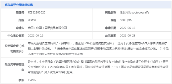 据悉,注射用Susoctocog alfa是首个获得美国FDA及欧洲EMA批准用于获得性血友病的重组猪FⅧ药物。2022年6月,该药的上市申请(JXSS2200020)获CDE受理,随后被纳入优先审评,拟用于获得性血友病A成人患者按需治疗和出血事件的控制。