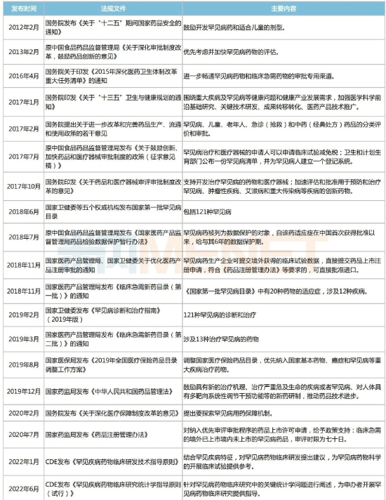 2018年5月,国家卫健委、工业和信息化部、国家药监局等五部门联合发布《第一批罕见病目录》,共涉及121种罕见病(文末附病种目录),为各部门制定罕见病相关政策提供重要依据。2022年11月,中国罕见病联盟召开2022年中国罕见病大会称,2022年国家医保药品目录调整,对罕见病用药开通单独申报渠道,支持其优先进入医保药品目录......