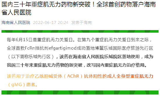 根据再鼎医药新闻稿介绍,艾加莫德α注射液是首个在美国和日本获批用于成人全身型重症肌无力治疗的FcRn拮抗剂,并已成功落地我国海南博鳌乐城国际医疗旅游先行区。2022年6月,海南省人民医院乐城分院在国内开出该药首个处方,预示着三十年来我国重症肌无力药物即将开启的新突破。