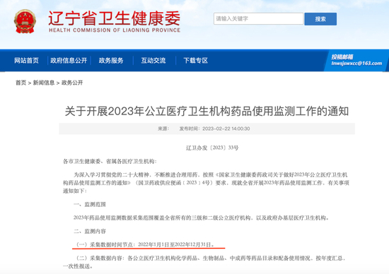 此次辽宁省卫健委发布的《关于开展2023年公立医疗卫生机构药品使用监测工作的通知》(下称《通知》),是按照《国家卫生健康委药政司关于做好2023年公立医疗卫生机构药品使用监测工作的通知》(国卫药政供应便函【2023】4号)要求,对全省开展2023年药品监测工作。
