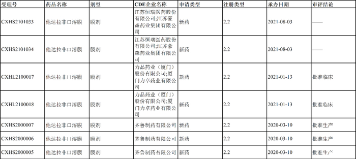 此外,齐鲁制药率先布局口溶膜市场,其他达拉非口溶膜2.5mg、5mg、10mg规格于2022年1月获批上市,目前齐鲁制药共有7品规他达拉非产品上市。而恒瑞医药与豪森药业共同申报的他达拉非口溶膜上市申请同样于2021年8月获得CDE受理。