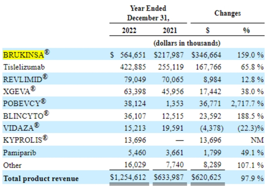财报显示,泽布替尼2022年全球销售额5.65亿美元,同比增长159%;替雷利珠单抗4.23亿美元,同比增长65.8%,在中国的PD-(L)1类产品中取得了领导者的地位。