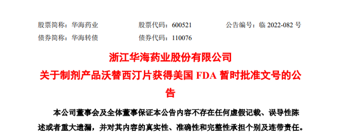 华海药业制剂获FDA批准文号