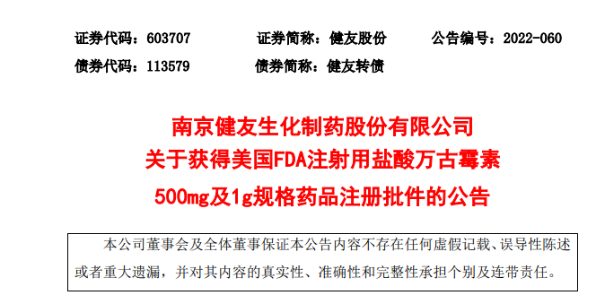南京健友生化制药股份有限公司(以下简称“健友股份”或“公司”)于近日收到美国食品药品监督管理局(以下简称“美国 FDA”)签发的注射用盐酸万古霉素,500mg/瓶、1g/瓶(ANDA 号:215197)批准信。