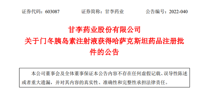 甘李药业门冬胰岛素注射液获哈萨克斯坦注册批件