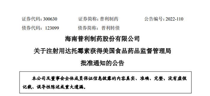 海南普利药业注射用达托霉素获得FDA批文