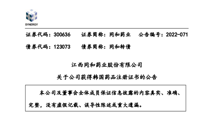 同和药业API获韩国注册证书