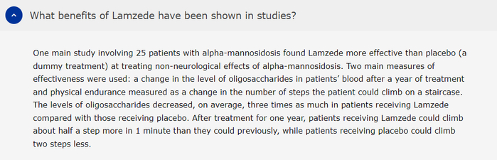 III期试验包括患有α-甘露糖苷症的成人和儿童患者。与安慰剂相比,在12个月时,Lamzede治疗证明了3分钟爬楼梯试验、6分钟步行试验和用力肺活量的改善。此外,血清寡糖浓度的降低支持了velmanase alfa的功效。
