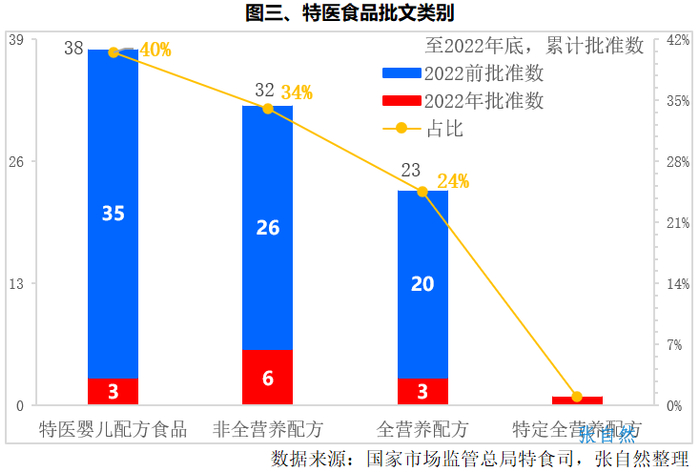 其中,批文最多的是特医婴儿配方食品,有38个批文,占了批文总数的40%。