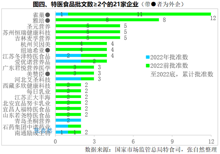 截至2022年底,共有38家企业持有特医食品批文,包括外企4家,本土34家。其中,外企共有27个批文,占了29%。
