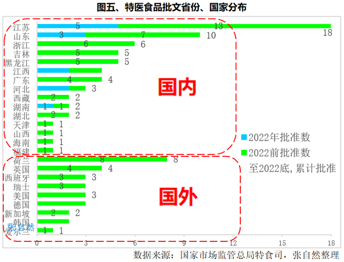 截至2022年底,累计批准的94个特医食品批文分别来自9个不同国家和我国的15个省。
