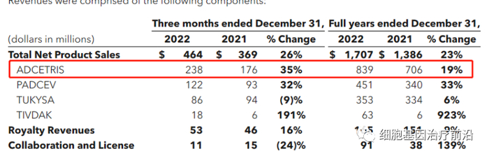 武田和seagen共同开发的Adcetris 位居第二,合计营收14.69亿美元,同比增长16%。Seagen在年报中披露去年营收8.4亿美元,同比增长19%,增速较去年的7%有所上升。