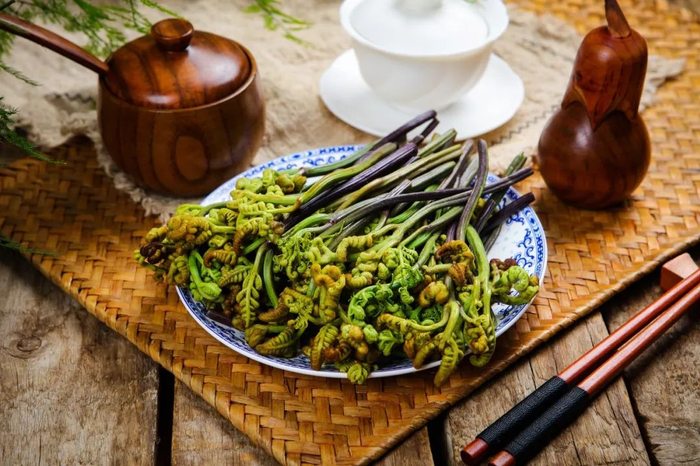将蕨菜焯水后凉拌或是配合菌菇肉类炒食都是很好的食用方法,还可将蕨菜制成干菜进行储存。