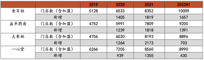 几大连锁药店每年都处于扩增门店的状态,根据各公司年报,2021年大参林门店数净增2173家,净增长率36%;老百姓1819家,净增长率28%;益丰大药房净增1818家,净增长30%;一心堂门店新增1023家,净增长14%。