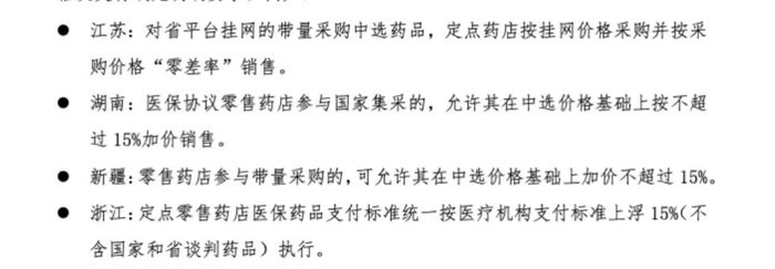 从药店“零差率”的角度来看,目前全国共23个省份发文对零售药店集采产品价格或医保支付标准有明确价格规定,仅北京、天津、河北、吉林、黑龙江、安徽、贵州和宁夏8省未出台政策,有些地方要求集采药品“零差率”售卖,有的则按不超过15%的加价销售。