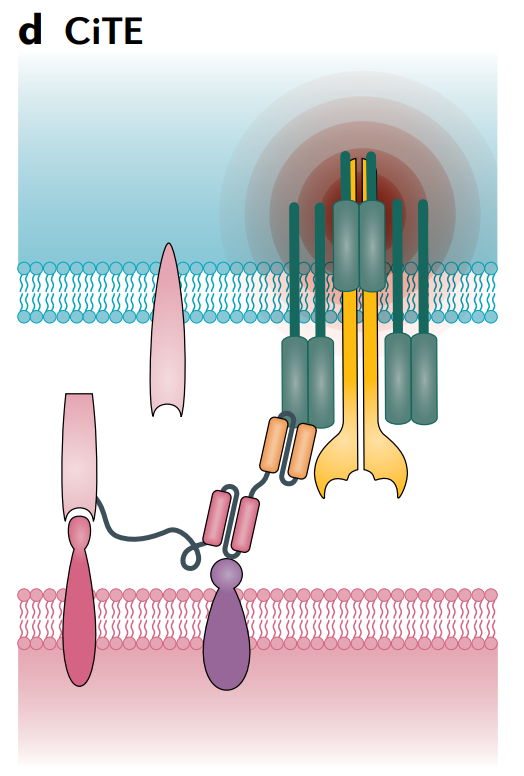 这种新型T细胞接合器的概念证明已在AML的临床前模型中得到验证。基于类似的机制,Horn等人已经开发出一种抗PD-L1–CD3的BiTE,它同时将内源性T细胞和NKT细胞重新定位到PD-L1+细胞。临床前研究表明,当与其他不能中和PD-1/PD-L1介导的免疫抑制的免疫疗法联合使用时,这种形式的CiTE可能对PD-L1表达的实体瘤患者有效。
