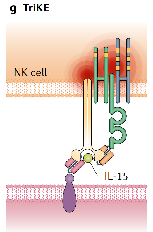 增强效应细胞细胞毒性的另外一种形式是三特异性杀伤接合器(TriKEs),其主要目的是利用NK细胞对抗癌细胞的活性,并包含与免疫刺激细胞因子相连的双特异性抗体。一种抗CD33-CD16/IL-15的TriKE能将NK细胞定向到髓系母细胞,目前正在AML患者中进行临床研究(NCT03214666)。