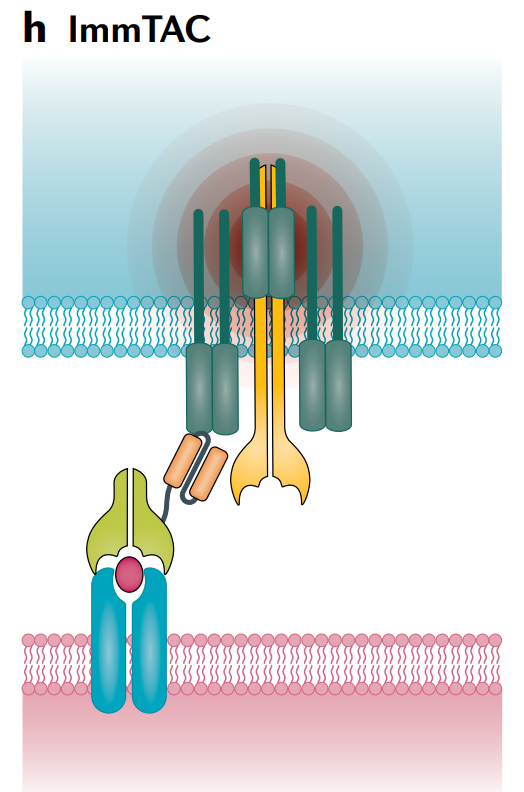 抗癌免疫动员单克隆T细胞受体(ImmTACs)是一种新型的双功能抗体药物,结合了基于TCR的靶向系统和抗CD3单链抗体效应器功能。因此,这些分子可以将多克隆效应性T细胞重定向到肽-MHC复合物中呈现的TAAs或肿瘤特异性新抗原,包括来自细胞内蛋白质的抗原。通过利用可溶性高亲和力单克隆TCR结构域促进大量多克隆效应T细胞的招募,这类分子有潜力以现成的形式克服非炎性环境的TME。