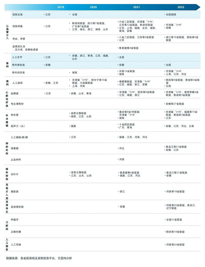 2019年安徽、江苏两省率先试点高值耗材带量采购,打响了我国医疗器械带量采购“第一枪”,随后各地区以省级或省际联盟形式加速推进、扩大试点。目前已涉及逾10大类,超20个品种。