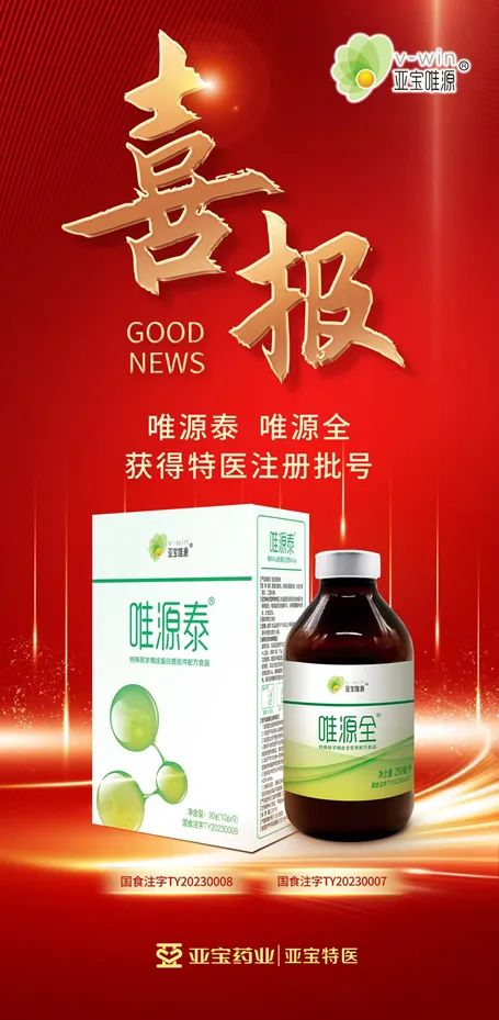 近日,亚宝药业集团自主研发的两款产品:唯源全®特殊医学用途全营养配方食品(以下简称唯源全®)、唯源泰®特殊医学用途蛋白质组件配方食品(以下简称唯源泰®),正式获得国家市场监督管理总局批准,批准文号分别为国食注字TY20230007、国食注字TY20230008。