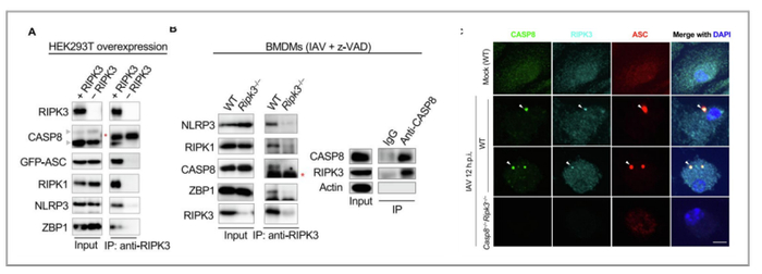 图4 . 凋细胞形成的实验证据。(A)对过表达凋细胞成分的HEK293T细胞中RIPK3的免疫沉淀(B)在IAV感染的WT和RIPK3中RIPK3 的免疫沉淀— / — BMDMs(左)和WT细胞中CASP8的免疫沉淀显示细胞细胞的关键成分之间的相互作用。(C)IAV感染的BMDMs中指示分子的免疫荧光染色显示细胞细胞的主成分共定位。在MOI = 20下用IAV(PR8)感染BMDMs12小时,用抗asc、抗casp8和抗RIPK3染色。比例= 5 lm。星号表示非特异性的条带。