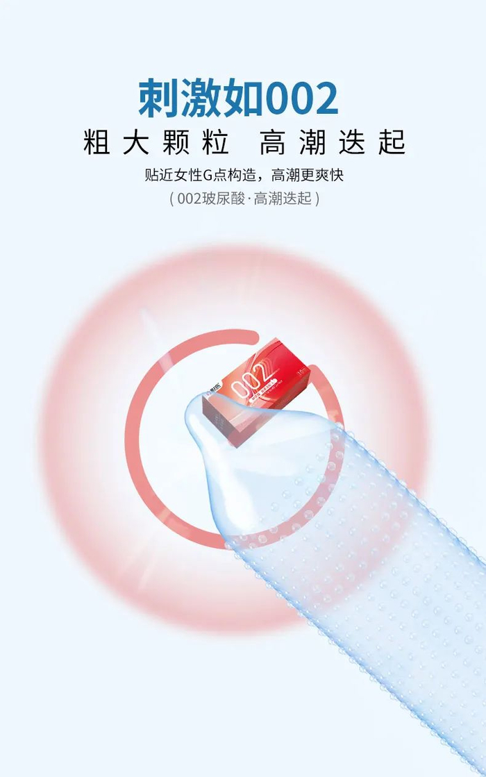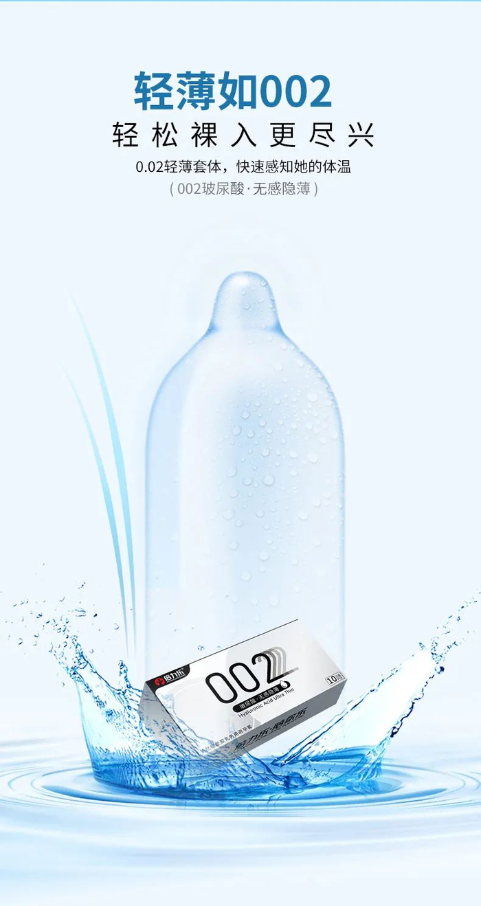 002系列玻尿酸避孕套为0.02mm超薄无感,价格相较001更低,且柔韧性远胜于001,内含玻尿酸粉嫩因子,高效补水加倍湿滑。