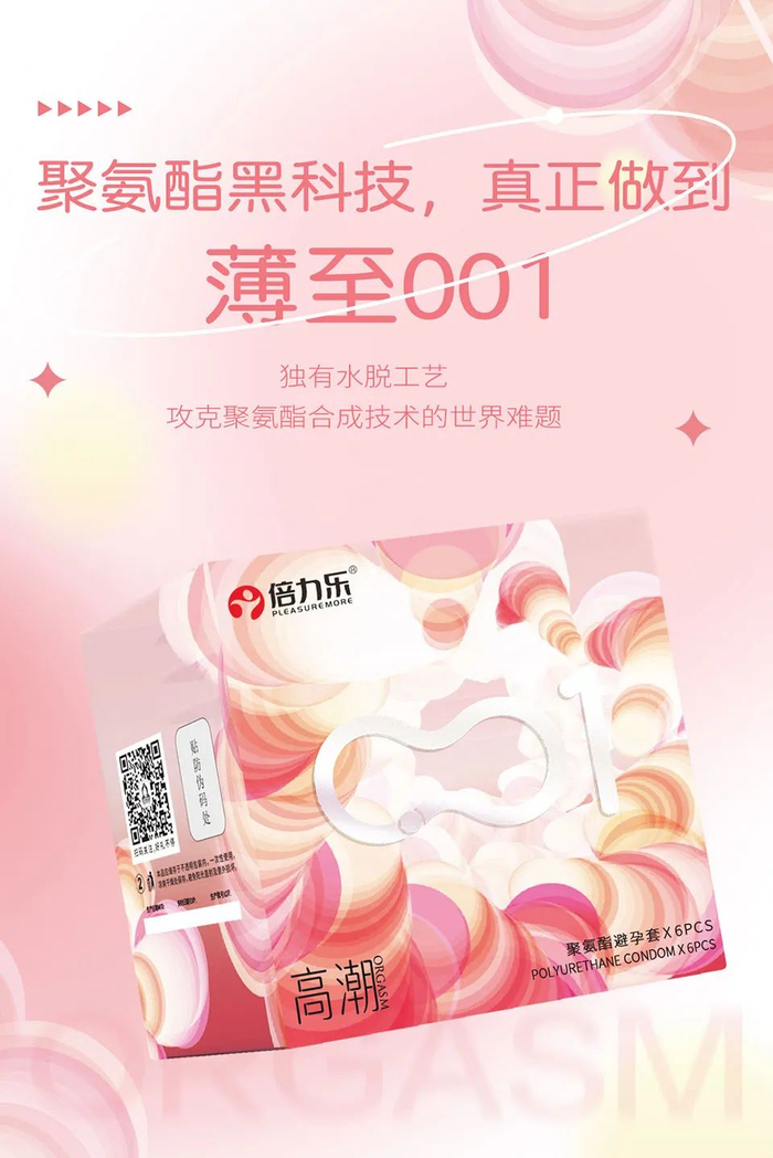 在聚氨酯001避孕套的基础上特别添加倍力乐独特快感因子,在薄的同时湿润爽滑,实现“无”套体验。