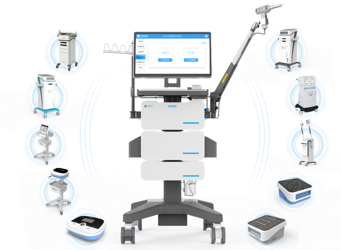 综合物理治疗系统包含冲击波、红外偏振光、肌电生物反馈、干扰电、中频、超声波、痉挛肌、经皮神经、神经肌肉、脉冲磁十大物理治疗因子,有利于改变传统理疗产品疗法单一、管理不便、操作复杂的现状,改善科室使用环境,提高工作效率,降低使用者工作强度和运作成本,形成综合理疗方案。