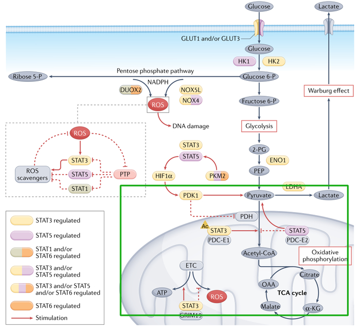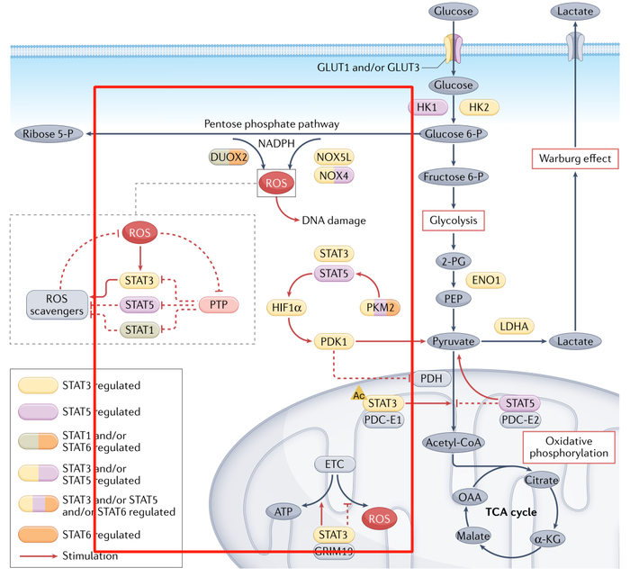 Warburg和氧化磷酸化是两个相互排斥的代谢过程,但STAT能够以直接和间接的方式对二者进行调控,通过增强胞质中糖酵解和线粒体内氧化磷酸化的,维持其存活、增殖、侵袭、转移。