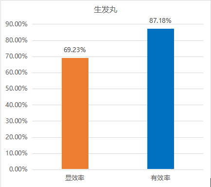 生发丸治疗斑秃性脱发效果明显。由四川省第四人民医院开展的生发丸治疗肝肾不足型斑秃102例中,服用生发丸一次6克,一天三次,疗程为8-12周。生发丸治疗肝肾不足斑秃有效率为87.18%,同时可以明显改善斑秃症状,如改善秃发斑面积、头发焦黄或花白、头发稀疏、腰膝酸软、头昏的中医症状方面均有明显效果。