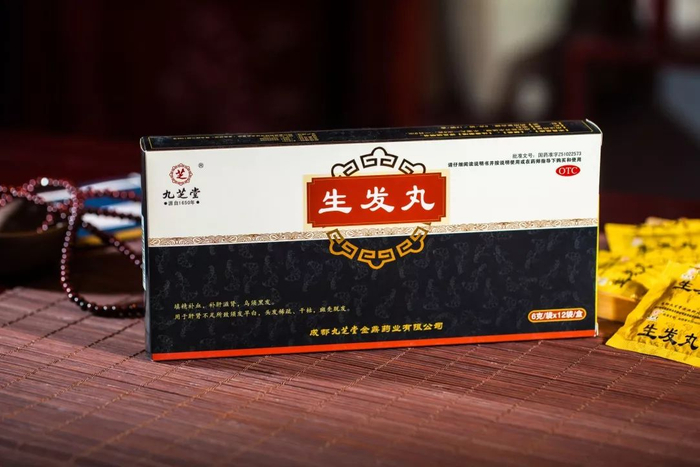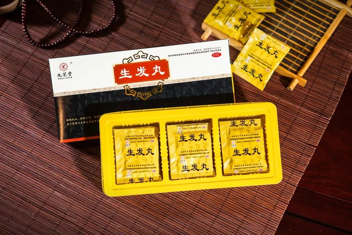 生发丸由九芝堂专业研发并生产销售。由27味名贵中药材组成,主要以补肾虚为主。方中黄芪、当归取“当归补血汤”之义以益气生血,首乌、黑芝麻养血乌须,生发黑发;熟地黄、紫河车滋肾填精,六药合用,填精补血共为君药。补骨脂、牛膝、枸杞、菟丝子、女贞子、墨旱莲、桑葚、桑寄生、沙苑子、骨碎补、蛇床子补肝滋肾,养血填精为臣药;肺主皮毛,故黄精、灵芝、核桃仁、五味子滋肺益肾,补虚润发,为佐药;生地黄、侧柏叶凉血清热;苦参、茯苓祛湿健脾;山楂化积散瘀,既清阴血不足所生之虚热,又祛湿化滞,使补不碍胃,腻不滞脾,而为佐药。共成填精补血,补肝滋肾,乌须黑发之剂。
