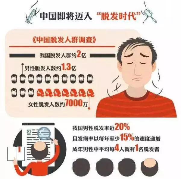 数据表明,我国脱发人群已超2亿人,其中成年男性中平均每4人就有1名脱发者,女性脱发人群也达7000万人。很多人年纪轻轻就出现了脱发现象,脱发再也不是老年人的专利了。