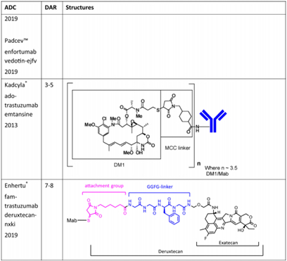 2000年,第一列ADC药物Pfizer'sMylotarg™上市。在此之后,ADCs陆续不断接连面市,并逐渐成为癌症治疗的最显著疗法之一。Mylotarg™平均药物抗体比(Drugto Antibody Ratio,DAR)可实现每分子量抗体承载2-3个分子量的卡奇霉素。虽然MylotargTM已被撤回,但在2017年又被重新引入市场。至今为止,已有10种ADCs在售。