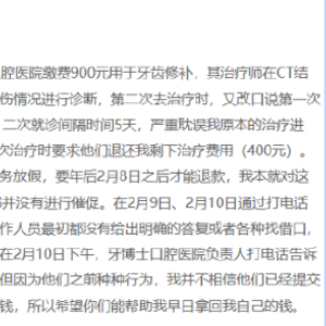 同年4月28日,另一位患者通过黑猫投诉平台反映:自己曾前往石家庄牙博士口腔医院进行牙齿矫正,付费后医生表示能力有限,并建议前往其他医院就诊。但牙博士迟迟不处理退费事宜,拖延三年之久。