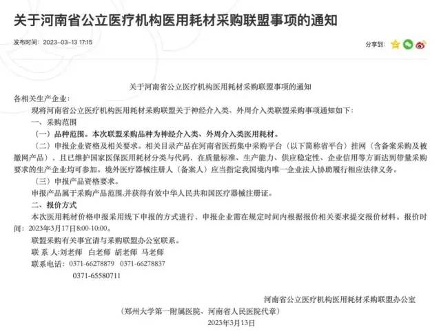3 月 13 日,河南省公立医疗机构医用耗材采购联盟办公室发布《关于成立河南省公立医疗机构医用耗材采购联盟的通知》。本次采购的品种范围为神经介入类、外周介入类医用耗材,采用线下申报的方式进行,报价时间为 3 月 17 日上午。