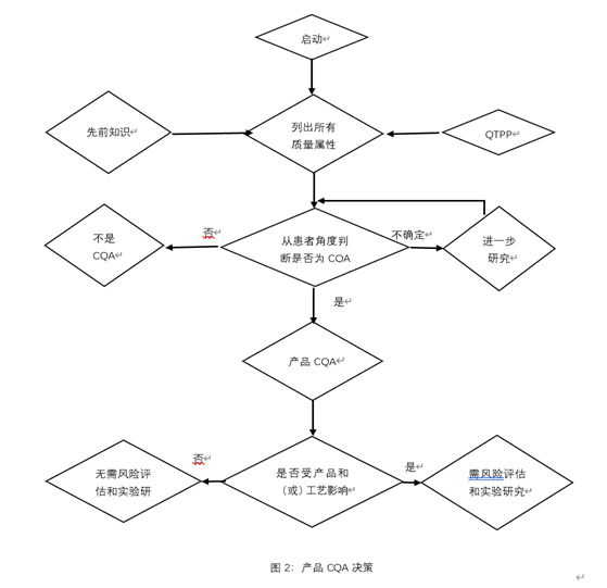 关键质量属性(CQA)是应该在适当的限度、范围或分布之内的物理、化学、生物或微生物性质或特征,用以确保所需的产品质量和临床的有效性与安全性。一般来说,CQA 与原料药、辅料、中间体 (过程中物质)和药品相关。一个属性是否为CQA取决于当该属性超出可接受范围时由风险评估获得的该属性对临床有效性和安全性的影响程度和不确定性,下图是产品CQA决策树。