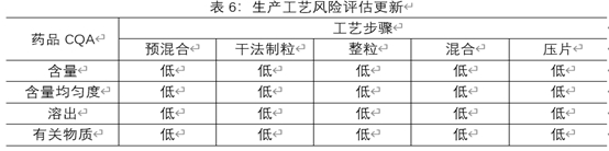 4.4根据对各高风险物料属性和工艺参数的考察,确定了高风险物料属性和工艺参数的可接受范围,并将它们纳入控制策略之中下表总结了某仿制药A片剂处生产工艺风险评估更新,由于各制剂特性及所用辅料的特性,该风险评估额合理性说明不在阐述。