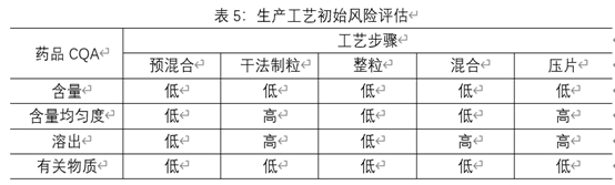 基于对临床有效性和安全性的考虑,确定可能被工艺步骤影响的产品CQA和确定影响产品CQA的每个工序工艺步骤中的输出物料(中间体)CQA,并对影响中间体CQA的物料属性和工艺参数进行风险评估,对评为高风险的物料属性和工艺参数进行研究,以便优化生产工艺并降低产品CQA不合格的风险。对整个生产工艺的风险评估结果见表5,由于各制剂特性及所用辅料的特性,该风险评估额合理性说明不在阐述。